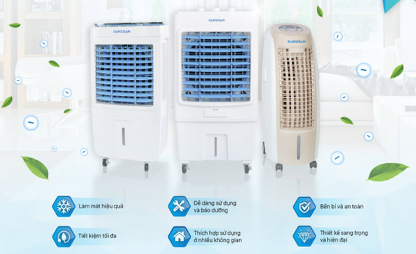 Quạt hơi nước là lựa chọn trung gian giữa điều hòa và quạt thường. Thiết bị này làm mát qua hơi nước, không làm khô da và tiết kiệm điện hơn máy lạnh. Phù hợp cho phòng trọ, phòng nhỏ hoặc không gian kín, quạt hơi nước làm mát tốt. Thêm đá lạnh vào ngăn chứa để tăng hiệu quả hạ nhiệt.