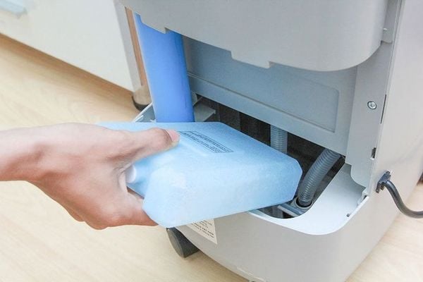 Đặt cục đá khô vào tủ đông, chờ đông cứng (khoảng 3 tiếng) rồi lấy ra và cho vào thùng chứa nước của quạt hơi nước.