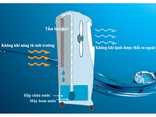 - Không khí nóng vào đây được làm dịu do hiệu ứng bay hơi của nước trên tấm làm mát.