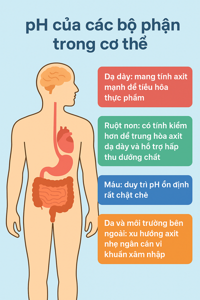 Cơ thể lý tưởng duy trì pH trong khoảng 7.35 – 7.45, nghĩa là hơi kiềm nhẹ. Đây được coi là mức "vàng" để các hệ cơ quan hoạt động ổn định. Tuy nhiên, từng bộ phận trong cơ thể lại có mức pH khác nhau: