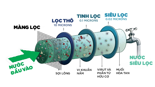 Màng lọc chính được xem như “trái tim” của máy. Với công nghệ RO, nước đi qua màng có thể loại bỏ đến 99,9% tạp chất, vi khuẩn, kim loại nặng và các hạt siêu nhỏ. Trong khi đó, Nano và UF thích hợp với nguồn nước ít ô nhiễm, vẫn giữ lại một phần khoáng chất tự nhiên.