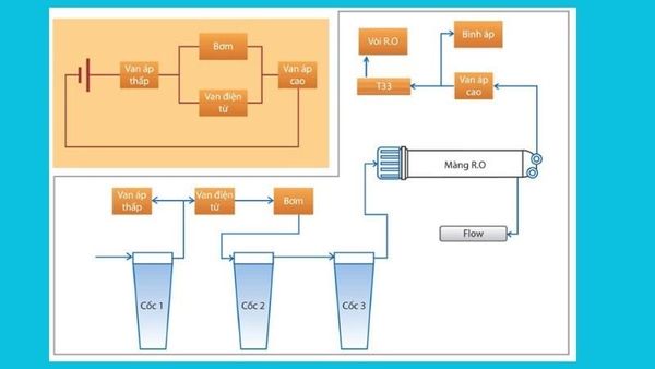 Nước tinh khiết được dẫn vào bình áp, nước bẩn đi ra ngoài qua đường xả thải.