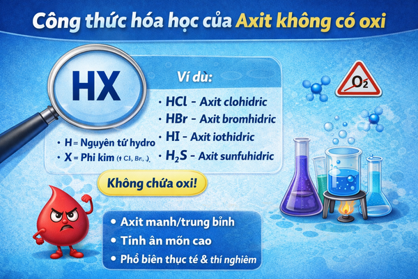 Axit không có oxi là những axit mà trong công thức hóa học không chứa nguyên tố oxi. Công thức thường có dạng HX hoặc H₂X.
