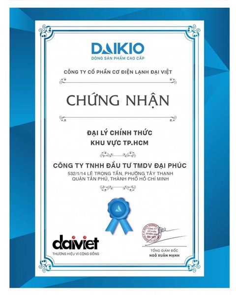 Hãng Daikio là thương hiệu Việt Nam, thuộc sở hữu và phát triển bởi Công ty Cổ phần Cơ Điện Lạnh Đại Việt. Các sản phẩm được lắp ráp tại nhà máy ở Thành phố Hồ Chí Minh, ứng dụng công nghệ Nhật Bản, mang lại sự đáng tin cậy về chất lượng.