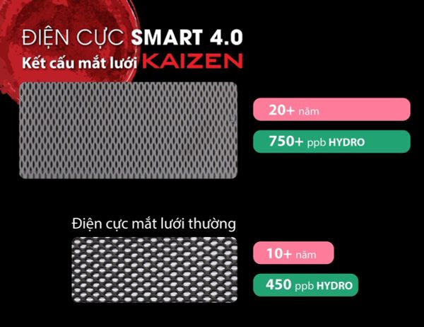 Máy sử dụng 5 tấm điện cực SMART 4.0 với cấu trúc mắt lưới Kaizen, làm từ titanium phủ platinum nguyên chất, giúp tăng hiệu suất điện phân và kéo dài tuổi thọ điện cực lên đến 20 năm.