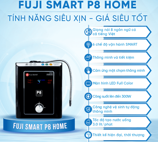 Máy lọc nước ion kiềm Fuji Smart P8 Home là lựa chọn hoàn hảo cho gia đình muốn sử dụng nguồn nước tinh khiết, chứa nhiều khoáng chất và hydro chống oxy hóa. Với công nghệ điện cực SMART 4.0, hệ thống lọc 16 tầng, dải pH trải rộng từ 3.0–10.5 và các tính năng thông minh như hướng dẫn giọng nói tiếng Việt, bảng điều khiển cảm ứng, vệ sinh tự động, P8 Home không chỉ tiện ích mà còn đảm bảo giá trị lâu dài cho sức khỏe. Nếu bạn đang tìm kiếm sản phẩm bền, hiệu quả, giá cả hợp lý và phù hợp với mọi thành viên trong gia đình, Fuji Smart P8 Home chắc chắn là sự lựa chọn xứng đáng.