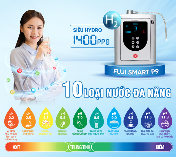 Fuji Smart P9 không chỉ là một máy lọc nước thông thường mà còn là thiết bị chăm sóc sức khỏe toàn diện cho gia đình. Với thiết kế sang trọng, công nghệ điện phân kép, 13 tấm điện cực tiên tiến, dải pH rộng và nồng độ hydrogen cao, P9 đáp ứng hầu hết các nhu cầu nước uống và sinh hoạt hằng ngày. Nếu bạn đang tìm kiếm một sản phẩm đầu tư lâu dài cho sức khỏe, tiết kiệm chi phí y tế và nâng tầm chất lượng cuộc sống, thì Fuji Smart P9 chính là lựa chọn xứng đáng.