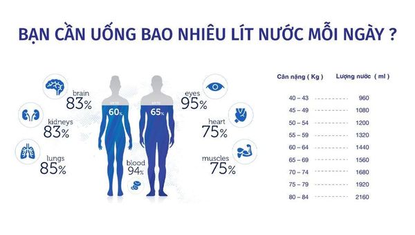 Lượng nước cần thiết mỗi ngày phụ thuộc vào cân nặng, mức độ vận động và môi trường sống. Trung bình, người trưởng thành nên uống khoảng 2–3 lít nước mỗi ngày.