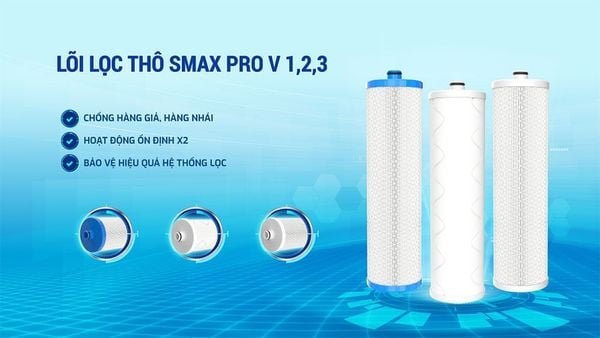 Ba lõi lọc đầu tiên đóng vai trò “lá chắn” để bảo vệ hệ thống lọc bên trong, giúp loại bỏ bụi bẩn, bùn đất, rong rêu, gỉ sét và các tạp chất lớn trong nước. Công nghệ Smax Pro V được cải tiến với bề mặt tiếp xúc rộng hơn gấp 3 lần so với lõi thông thường, cho khả năng lọc nhanh hơn và hiệu quả hơn.