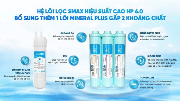 Sau khi đi qua màng RO, nước tinh khiết được đưa vào hệ lõi chức năng HP 6.0, gồm các lõi Bioceramic, Tourmaline, Mineral Plus, Far Infrared và Nano Silver Plus. Hệ lõi này tăng cường thêm khoáng chất tự nhiên, tạo ra ion âm có lợi, chia nhỏ phân tử nước để cơ thể dễ hấp thu, đồng thời cải thiện vị ngọt tự nhiên cho nước. Kết quả là bạn sẽ có nguồn nước không chỉ sạch mà còn tốt cho sức khỏe.