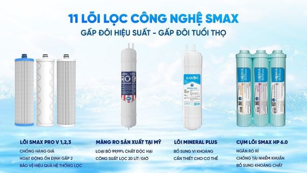 Karofi KAD-X56 trang bị tới 11 lõi lọc mới, sử dụng công nghệ Smax độc quyền giúp nâng cao hiệu suất lọc và kéo dài tuổi thọ so với thế hệ trước. Hệ thống lọc chia thành 3 giai đoạn: lọc thô, RO và lõi chức năng.
