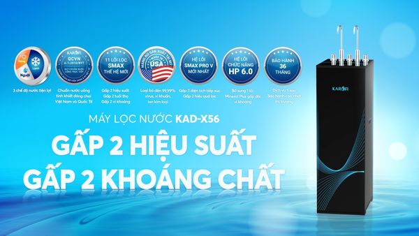 Máy lọc nước nóng lạnh Karofi KAD-X56 là một lựa chọn đáng giá cho gia đình Việt hiện nay. Sản phẩm hội tụ đầy đủ yếu tố của một thiết bị lọc nước cao cấp: thiết kế hiện đại, công nghệ lọc 11 lõi Smax tiên tiến, màng RO Purifim nhập khẩu Mỹ, cùng khả năng cung cấp ba chế độ nước tiện lợi cho mọi nhu cầu sinh hoạt. Không chỉ cung cấp nguồn nước tinh khiết đạt chuẩn quốc gia, KAD-X56 còn góp phần nâng cao chất lượng cuộc sống và bảo vệ sức khỏe người dùng. Với mức giá hợp lý, độ bền cao và chính sách bảo hành lâu dài, Karofi KAD-X56 xứng đáng là người bạn đồng hành đáng tin cậy trong mỗi gia đình.